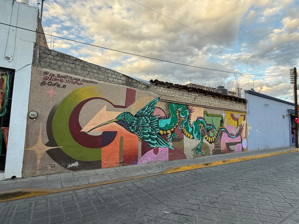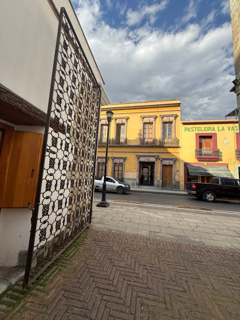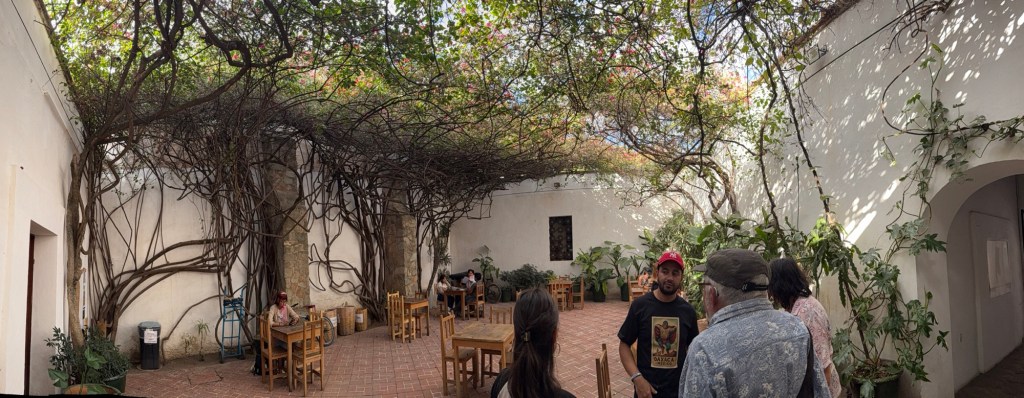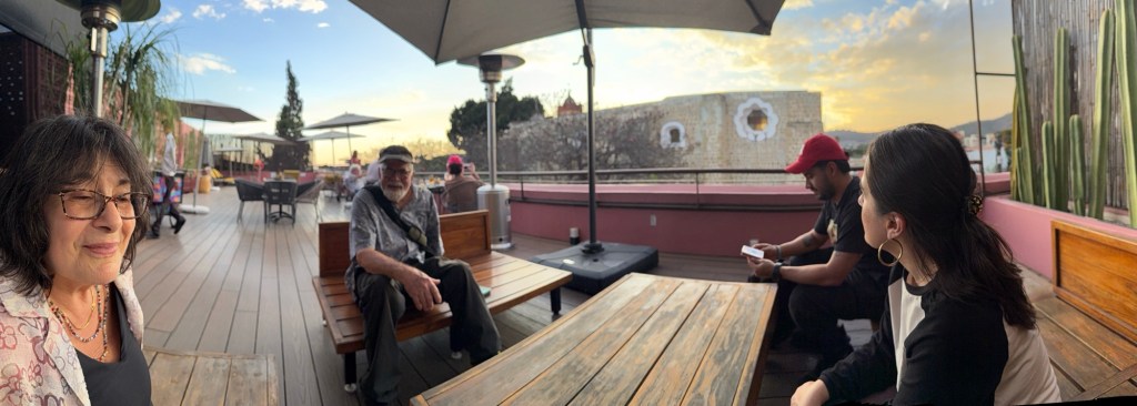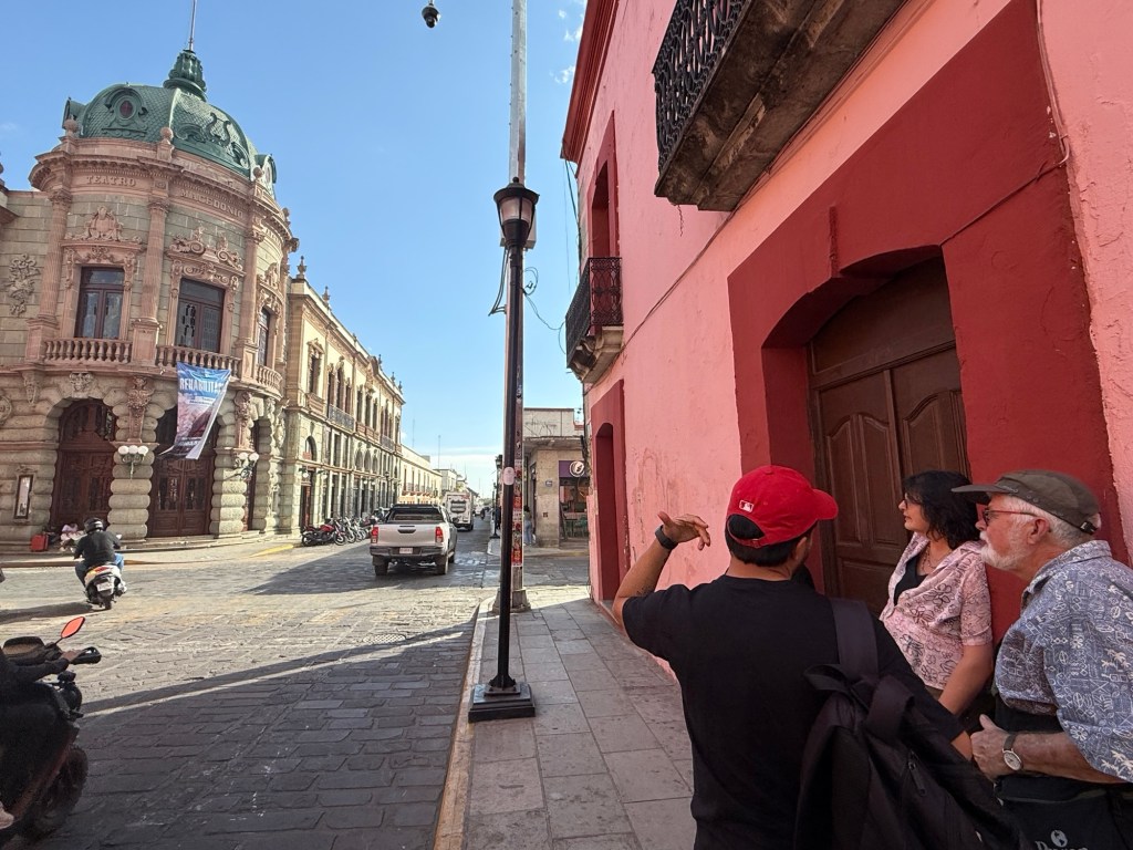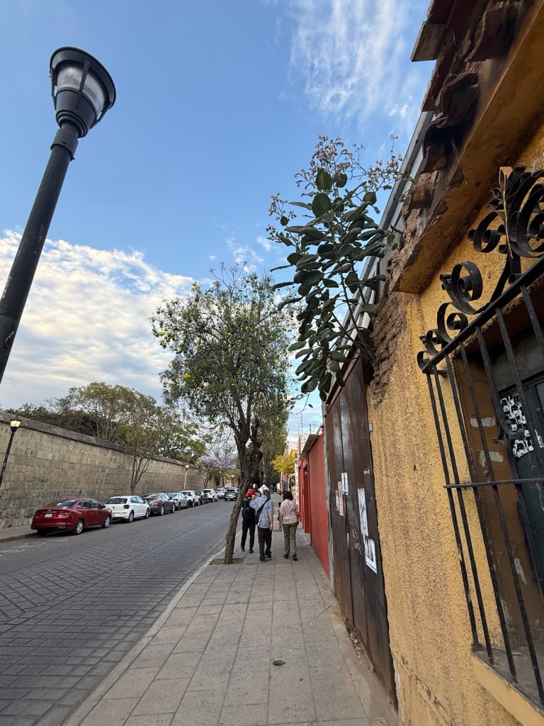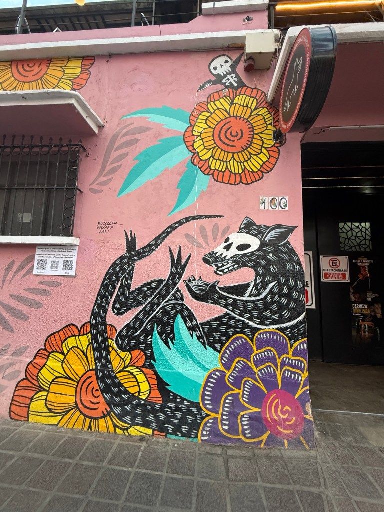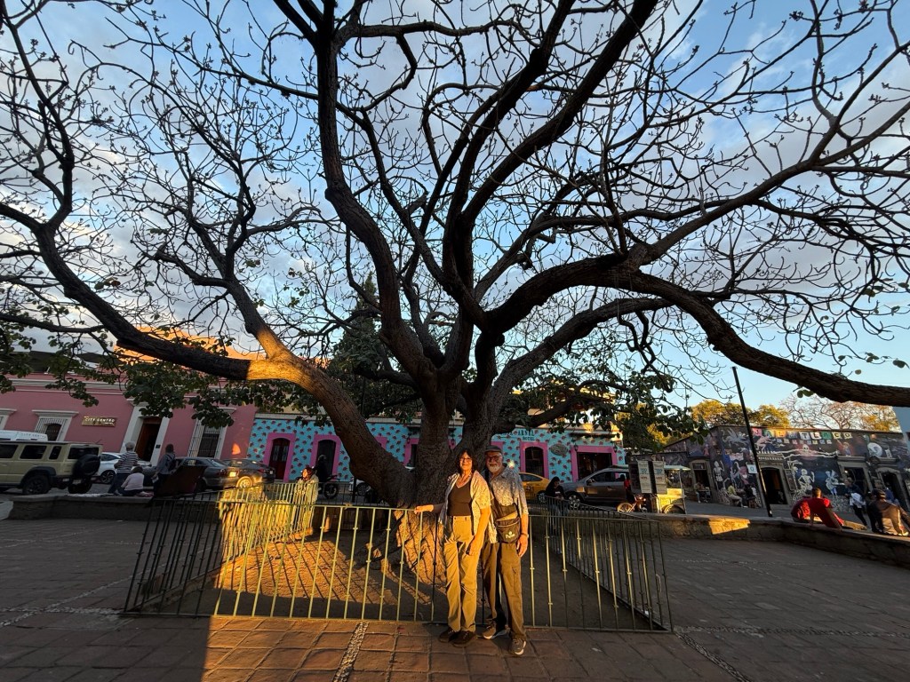 The processional music once they reached the street was an Italian anti-fascist tune. Not sure I captured that in this clip—Anita’s Italian and recognized it.Dave had perfect timing and captured the fireworks in this video. One poor fellow near us got hit in the face with burning debris…but it was spectacular!Our tour guide Fernando with the lucha t-shirt and red hat in a beautiful courtyard, part of an art center created by one of the city’s most reknowned artists, Francisco Toledo. Part of a beautiful gate made by Francisco Toledo of a kind of scorpions found here that is smaller than scorpions in Texas, for example. Fernando encouraged us to go inside buildings whose doors are open, as that signals an invitation. Often the exterior would give not clue to the beautiful interiors, usually with plant filled courtyards. An art nouveau style theatre (teatro) being renovated. A window on the teatro. Another Francisco Toledo gate and wish I’d crossed the street to zoom in on a gate inside the building across the street with a beautiful cricket design. Notice the path is a porous design with grass growing between the bricks. This is the entry to a lovely cultural arts center. The site was the former convent that had been used as a parking lot until Toledo and his friend Alfredo Harp Helu renovated it with a beautiful mix of old structures with modern additions. A hotel courtyard. Fernando loves the play of light and shadow depending on the time of day. The reflection of metal on the edge of the roof spells the hotel’s name only at a certain time of day. An ancient metate (for grinding corn) repurposed for flowers.Sculpture made by a famous blind artist called el señor de las sirenas (mermaids). I love the ironwork……and doors Fernando loves latticework that allows air and light (and in one later provides a place for birds to rest at night). Just a pretty building..Inside the stamp museumAnother chance for Dave to dance! Lots of families come out to parks at night. Besides dancers, there were roller skaters, and kids in electric cars. I remember in Cambodia parks at night filled with various exercise classes. So nice to have such beautiful tree-covered spaces where people come out to stroll, eat, play, and enjoy good company.Interior courtyard of stamp museumMore trees growing out of buildings…No murals in the historic center. Fernando took us east of town to a very colorful neighborhoodJust in time for the church bellsMarriot hotel interior courtyard that helps reduce noiseMore wonderful fish for dinner!How folks feel about our president…Another chance for Dave to dance! Lots of families come out to parks at night. Besides dancers, there were roller skaters, and kids in electric cars. I remember in Cambodia parks at night filled with various exercise classes. So nice to have such beautiful tree-covered spaces where people come out to stroll, eat, play, and enjoy good company.