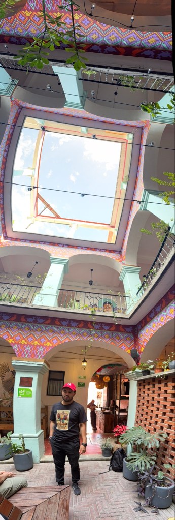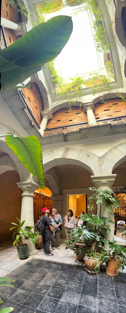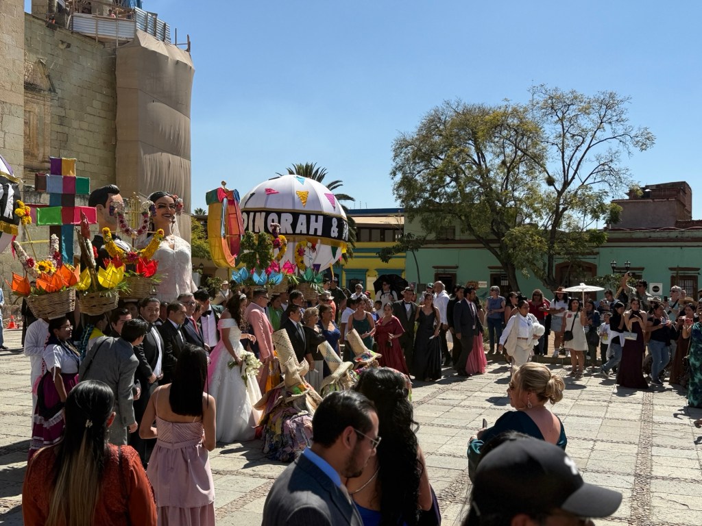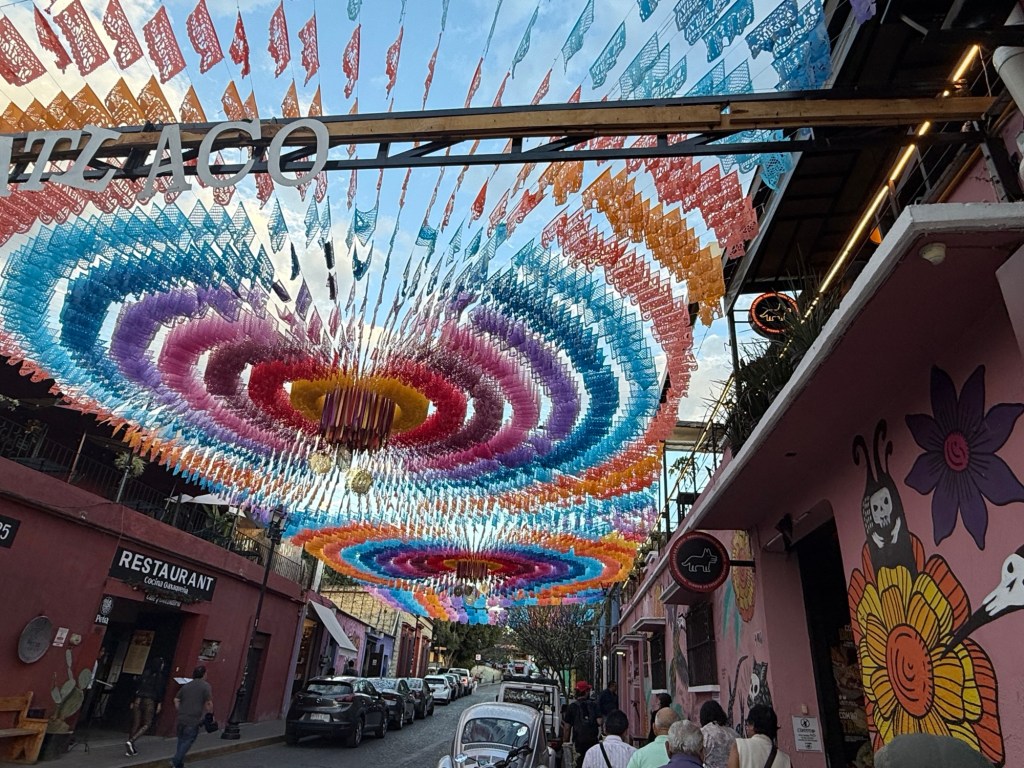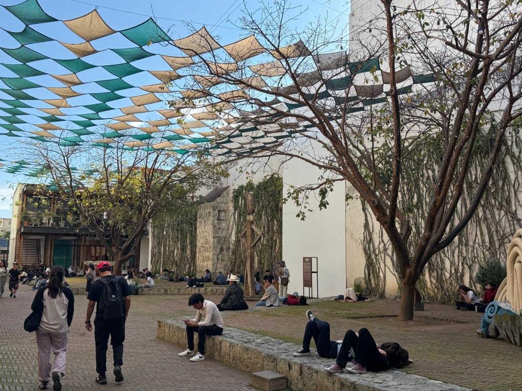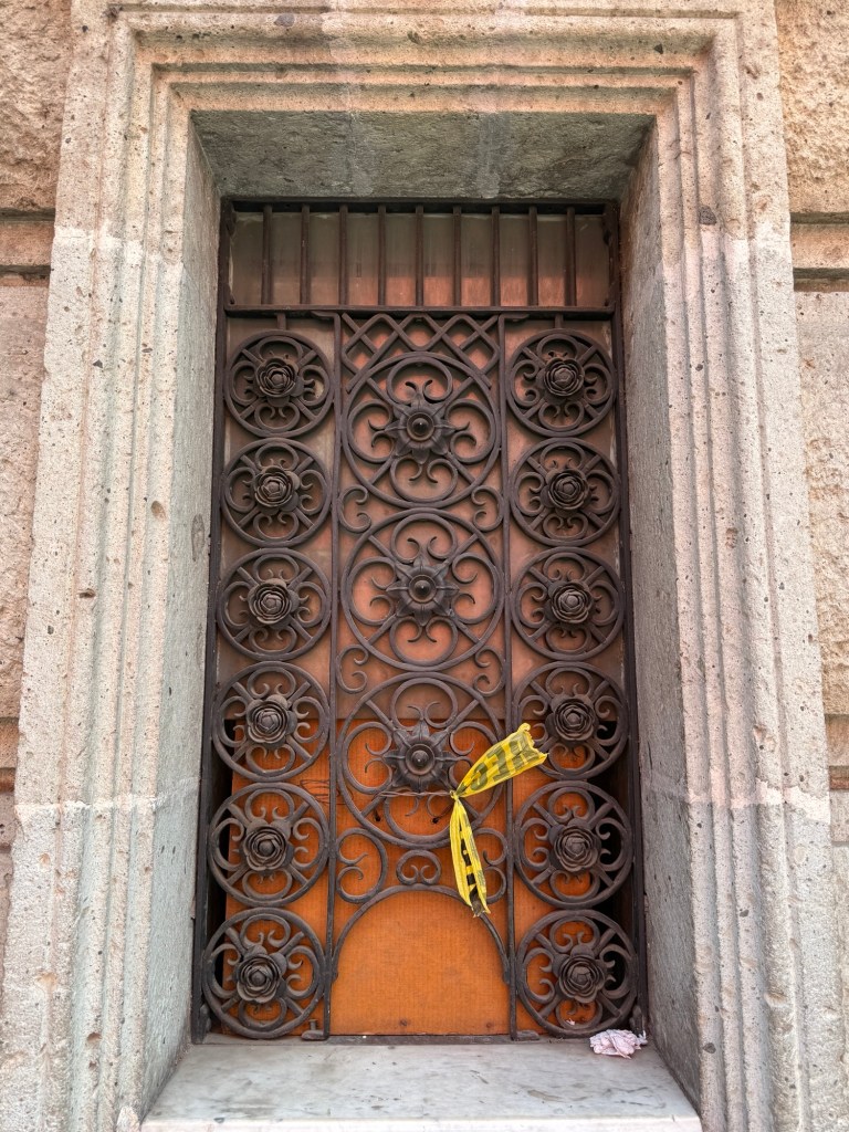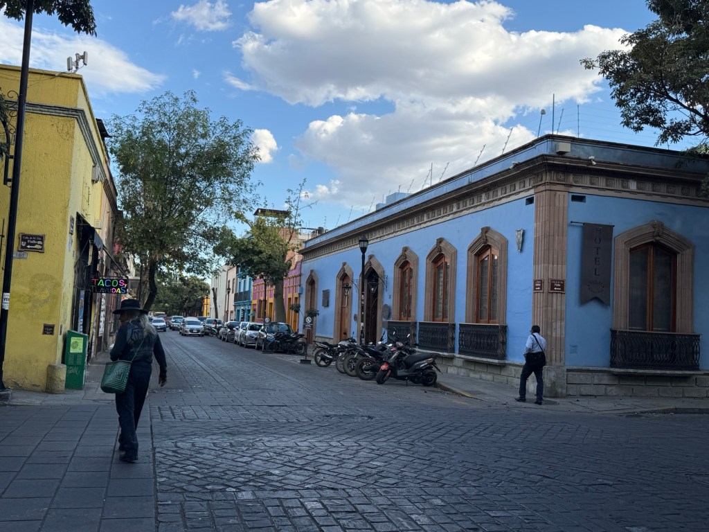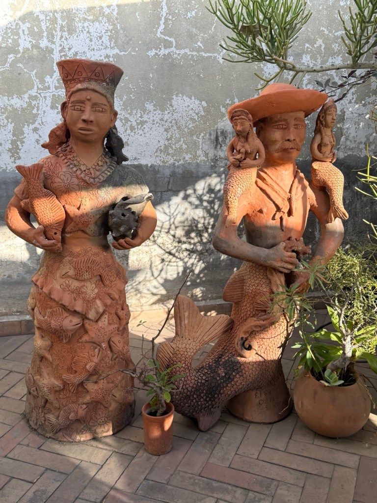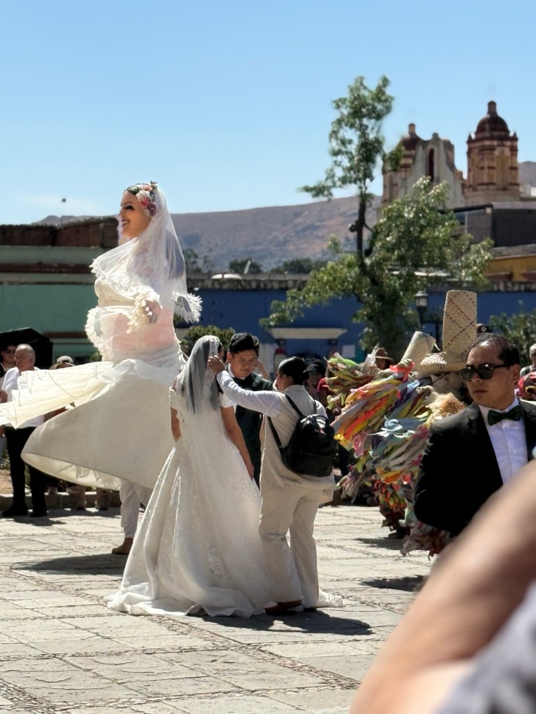 The processional music once they reached the street was an Italian anti-fascist tune. Not sure I captured that in this clip—Anita’s Italian and recognized it.Dave had perfect timing and captured the fireworks in this video. One poor fellow near us got hit in the face with burning debris…but it was spectacular!Our tour guide Fernando with the lucha t-shirt and red hat in a beautiful courtyard, part of an art center created by one of the city’s most reknowned artists, Francisco Toledo. Part of a beautiful gate made by Francisco Toledo of a kind of scorpions found here that is smaller than scorpions in Texas, for example. Fernando encouraged us to go inside buildings whose doors are open, as that signals an invitation. Often the exterior would give not clue to the beautiful interiors, usually with plant filled courtyards. An art nouveau style theatre (teatro) being renovated. A window on the teatro. Another Francisco Toledo gate and wish I’d crossed the street to zoom in on a gate inside the building across the street with a beautiful cricket design. Notice the path is a porous design with grass growing between the bricks. This is the entry to a lovely cultural arts center. The site was the former convent that had been used as a parking lot until Toledo and his friend Alfredo Harp Helu renovated it with a beautiful mix of old structures with modern additions. A hotel courtyard. Fernando loves the play of light and shadow depending on the time of day. The reflection of metal on the edge of the roof spells the hotel’s name only at a certain time of day. An ancient metate (for grinding corn) repurposed for flowers.Sculpture made by a famous blind artist called el señor de las sirenas (mermaids). I love the ironwork……and doors Fernando loves latticework that allows air and light (and in one later provides a place for birds to rest at night). Just a pretty building..Inside the stamp museumAnother chance for Dave to dance! Lots of families come out to parks at night. Besides dancers, there were roller skaters, and kids in electric cars. I remember in Cambodia parks at night filled with various exercise classes. So nice to have such beautiful tree-covered spaces where people come out to stroll, eat, play, and enjoy good company.Interior courtyard of stamp museumMore trees growing out of buildings…No murals in the historic center. Fernando took us east of town to a very colorful neighborhoodJust in time for the church bellsMarriot hotel interior courtyard that helps reduce noiseMore wonderful fish for dinner!How folks feel about our president…Another chance for Dave to dance! Lots of families come out to parks at night. Besides dancers, there were roller skaters, and kids in electric cars. I remember in Cambodia parks at night filled with various exercise classes. So nice to have such beautiful tree-covered spaces where people come out to stroll, eat, play, and enjoy good company.