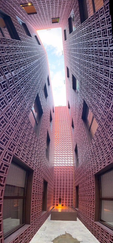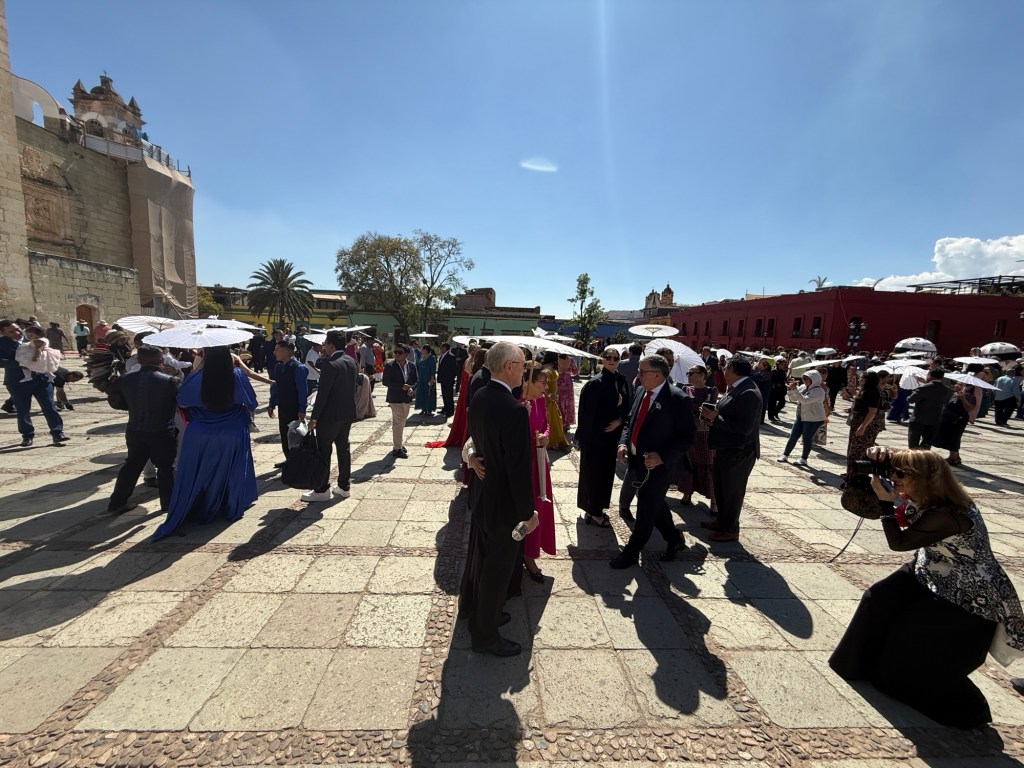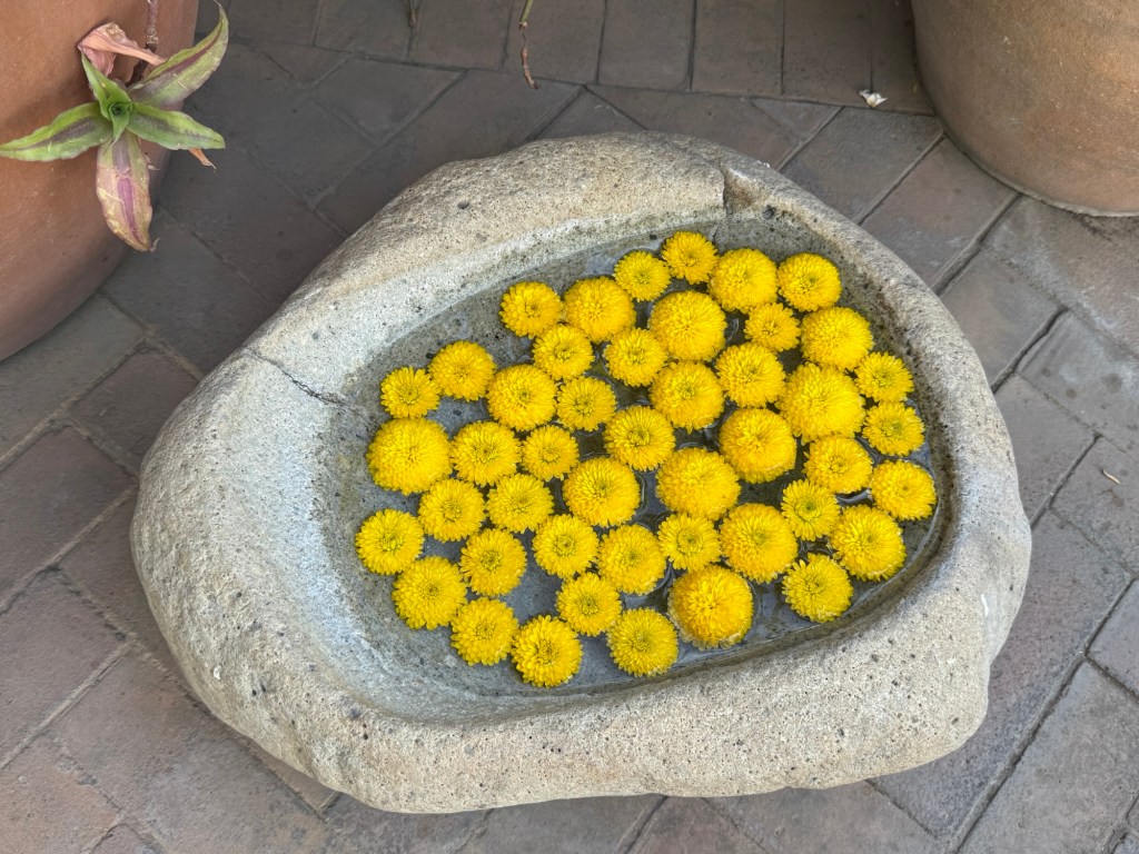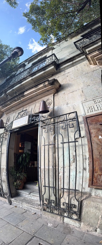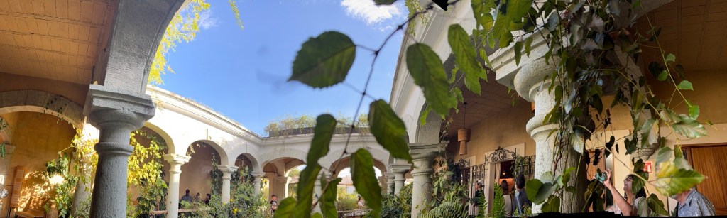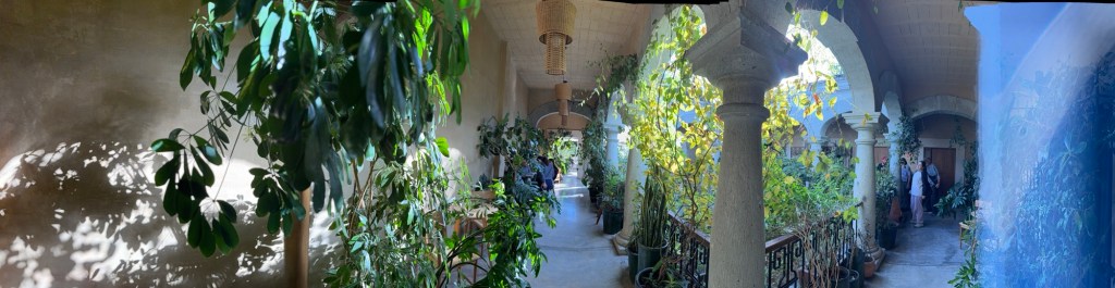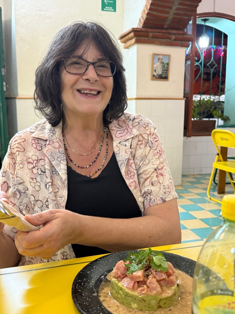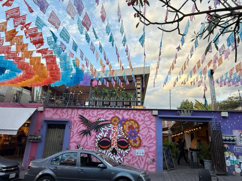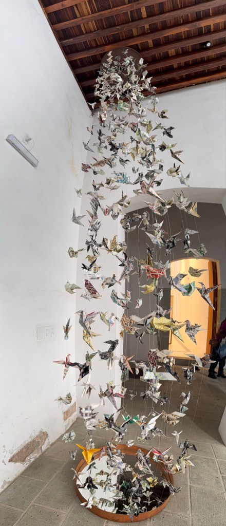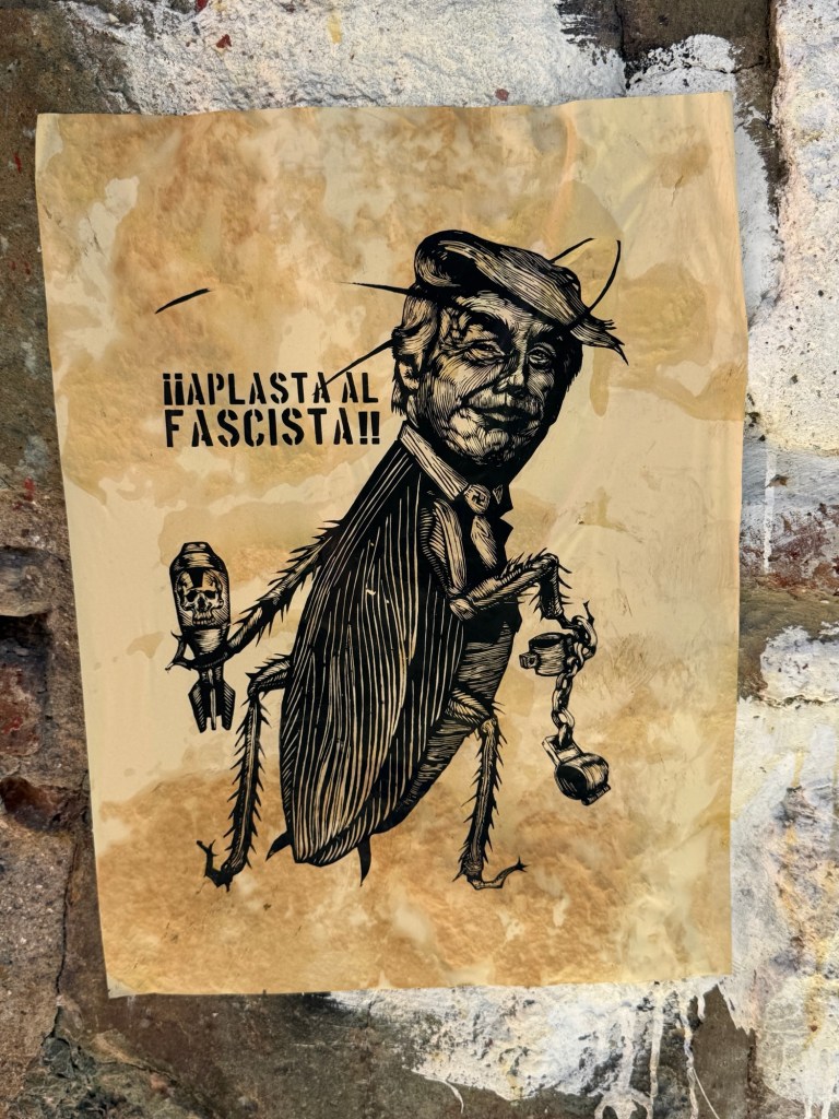 The processional music once they reached the street was an Italian anti-fascist tune. Not sure I captured that in this clip—Anita’s Italian and recognized it.Dave had perfect timing and captured the fireworks in this video. One poor fellow near us got hit in the face with burning debris…but it was spectacular!Our tour guide Fernando with the lucha t-shirt and red hat in a beautiful courtyard, part of an art center created by one of the city’s most reknowned artists, Francisco Toledo. Part of a beautiful gate made by Francisco Toledo of a kind of scorpions found here that is smaller than scorpions in Texas, for example. Fernando encouraged us to go inside buildings whose doors are open, as that signals an invitation. Often the exterior would give not clue to the beautiful interiors, usually with plant filled courtyards. An art nouveau style theatre (teatro) being renovated. A window on the teatro. Another Francisco Toledo gate and wish I’d crossed the street to zoom in on a gate inside the building across the street with a beautiful cricket design. Notice the path is a porous design with grass growing between the bricks. This is the entry to a lovely cultural arts center. The site was the former convent that had been used as a parking lot until Toledo and his friend Alfredo Harp Helu renovated it with a beautiful mix of old structures with modern additions. A hotel courtyard. Fernando loves the play of light and shadow depending on the time of day. The reflection of metal on the edge of the roof spells the hotel’s name only at a certain time of day. An ancient metate (for grinding corn) repurposed for flowers.Sculpture made by a famous blind artist called el señor de las sirenas (mermaids). I love the ironwork……and doors Fernando loves latticework that allows air and light (and in one later provides a place for birds to rest at night). Just a pretty building..Inside the stamp museumAnother chance for Dave to dance! Lots of families come out to parks at night. Besides dancers, there were roller skaters, and kids in electric cars. I remember in Cambodia parks at night filled with various exercise classes. So nice to have such beautiful tree-covered spaces where people come out to stroll, eat, play, and enjoy good company.Interior courtyard of stamp museumMore trees growing out of buildings…No murals in the historic center. Fernando took us east of town to a very colorful neighborhoodJust in time for the church bellsMarriot hotel interior courtyard that helps reduce noiseMore wonderful fish for dinner!How folks feel about our president…Another chance for Dave to dance! Lots of families come out to parks at night. Besides dancers, there were roller skaters, and kids in electric cars. I remember in Cambodia parks at night filled with various exercise classes. So nice to have such beautiful tree-covered spaces where people come out to stroll, eat, play, and enjoy good company.