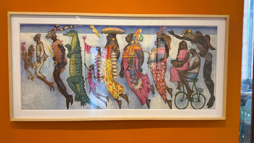 We had visited the textile museum on the architecture tour and I’d forgotten it was right next to the beautiful cultural arts center and another art gallery. The gallery was featuring works by Japanese artists influenced by or living in Mexico (I’m not sure, but maybe both) and I’m just sharing a couple pieces that made me smile.