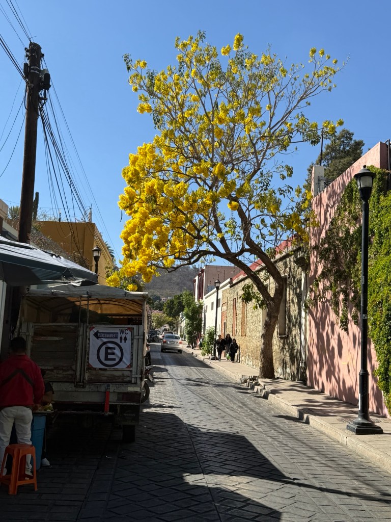 One reason the streets are filled with flowering trees is that they tend to bloom during the dry season. And in the central part of historic Oaxaca, many blind musicians also add their music.